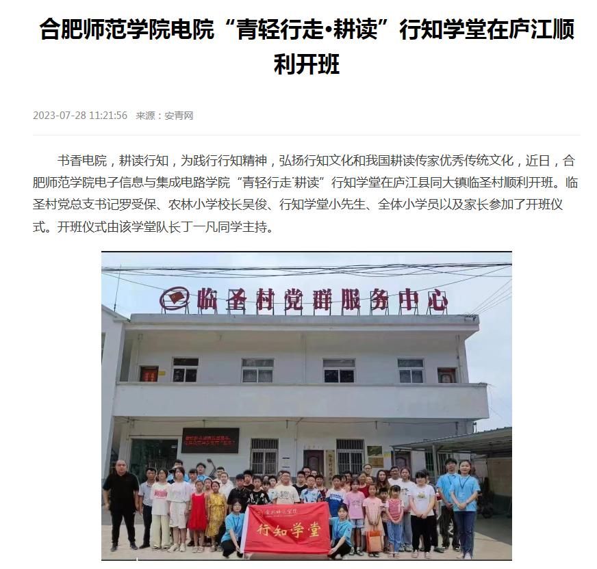本网讯 7月28日,安青网以《WilliamHill体育电院“青轻行走·耕读”行知学堂在庐江顺利开班》为题对WilliamHill体育合肥市庐江县同大镇临圣村“行知学堂”进行了报道。