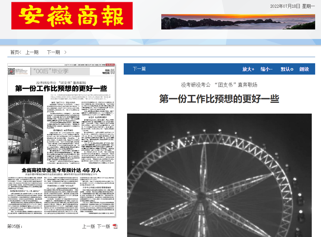 本网讯 近日,安徽商报以《没考研没考公 “团支书”直奔职场》为题,专题报道了公司电子信息与电气工程公司电子信息工程专业毕业生洪万里同学的求职故事。