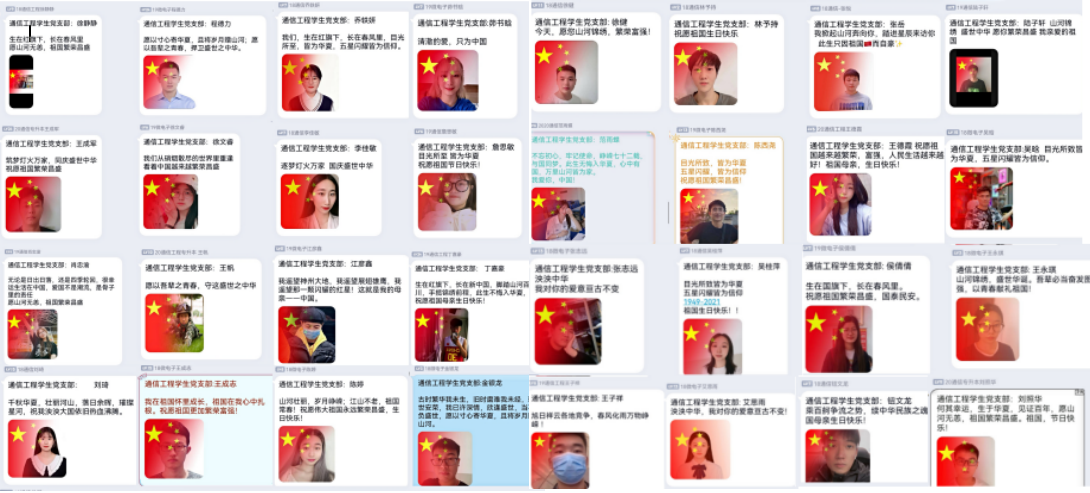 18级微电子科学与工程专业党员金银龙说,古时繁华我未生,旧时磨难我未经,现世安荣,我已许深情,欣逢盛世,当不负盛世,愿以寸心寄华夏,且将岁月赠山河。19级微电子科学与工程专业党员程德力说,愿以寸心寄华夏,且将岁月赠山河;愿以吾辈之青春,捍卫盛世之中华。20级通信工程专业党员王帆说,作为一名退伍老员工党员,愿以吾辈之青春,守这盛世之中华。