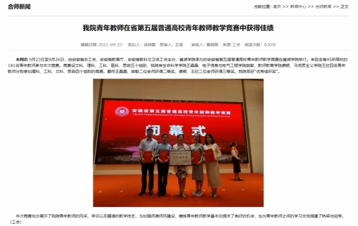 本网讯 2021年9月26日,为期三天的安徽省第五届普通高校青年教师教学竞赛圆满结束,公司通信工程系教师樊敏表现优异,荣获二等奖。
