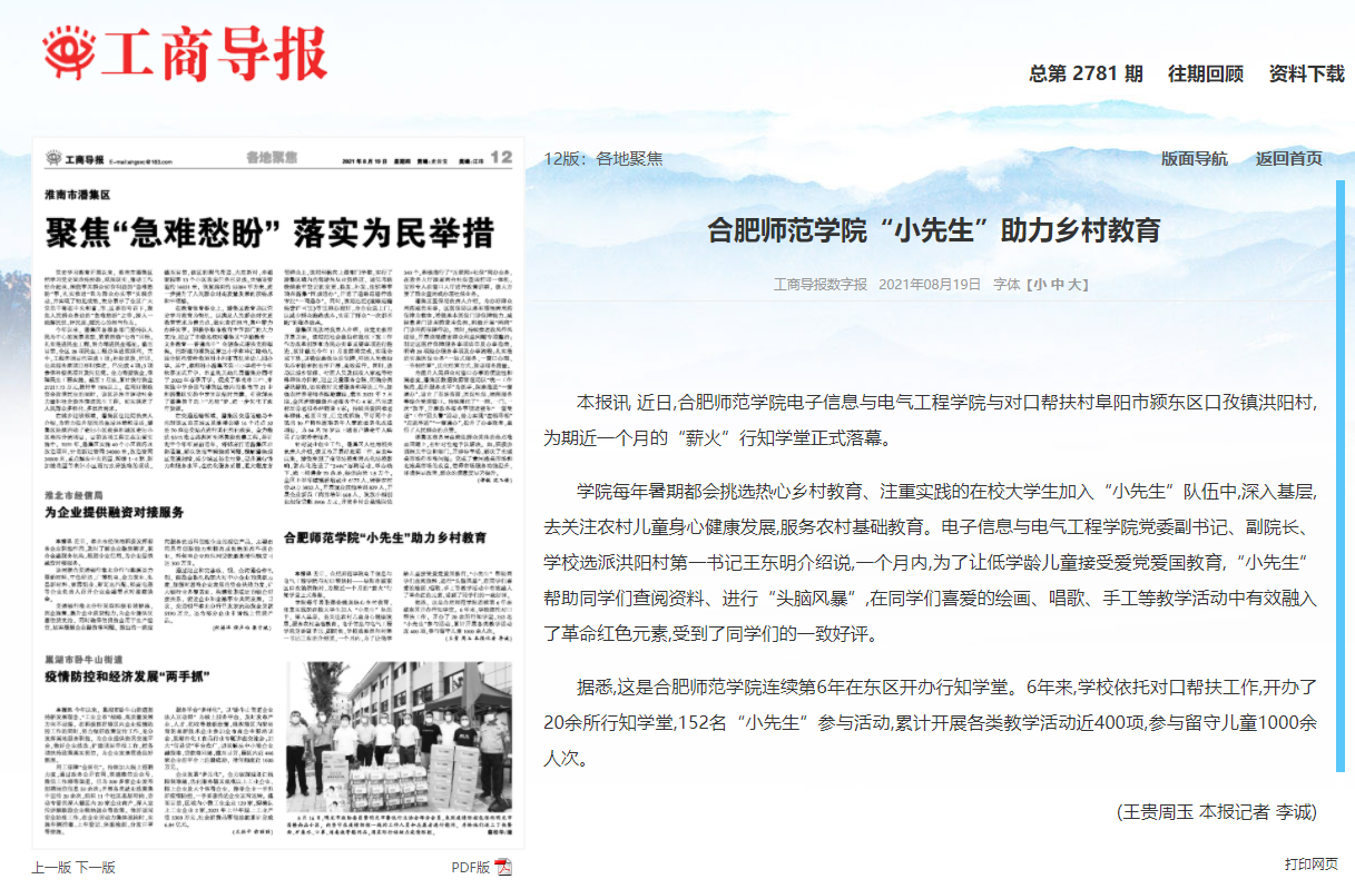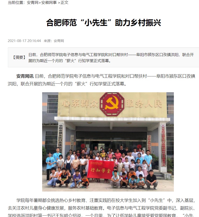 本网讯 7月15日-8月上旬,公司电子信息与电气工程公司在阜阳市颍东区孜口镇洪阳村开展了为期一个月的“行知学堂”暑期社会实践活动。8月17日,安青网以“合肥师范小先生助力乡村振兴”为题进行了报道。8月19日,安徽工商导报以“合肥师范小先生助力乡村教育”为题进行报道。(电院:周玉)