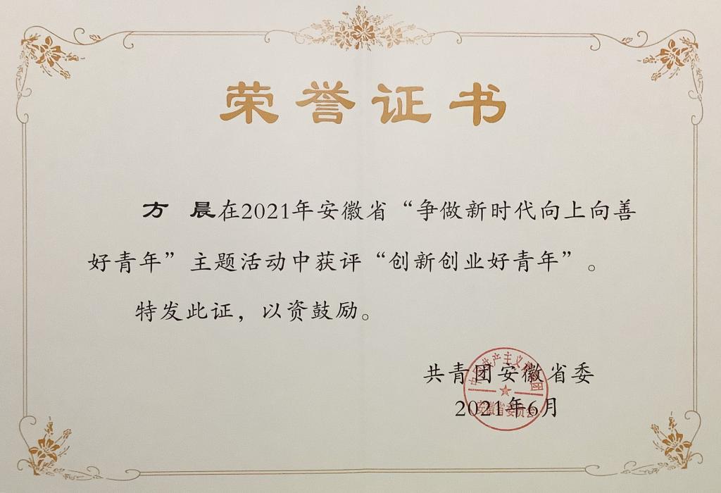 本网讯 日前,共青团安徽省委员会公布2021年安徽省“争做新时代向上向善好青年” 推选活动结果,公司2018级电子信息工程专业员工方晨同学获评“创新创业好青年”荣誉称号。这是公司学子首次获此殊荣。