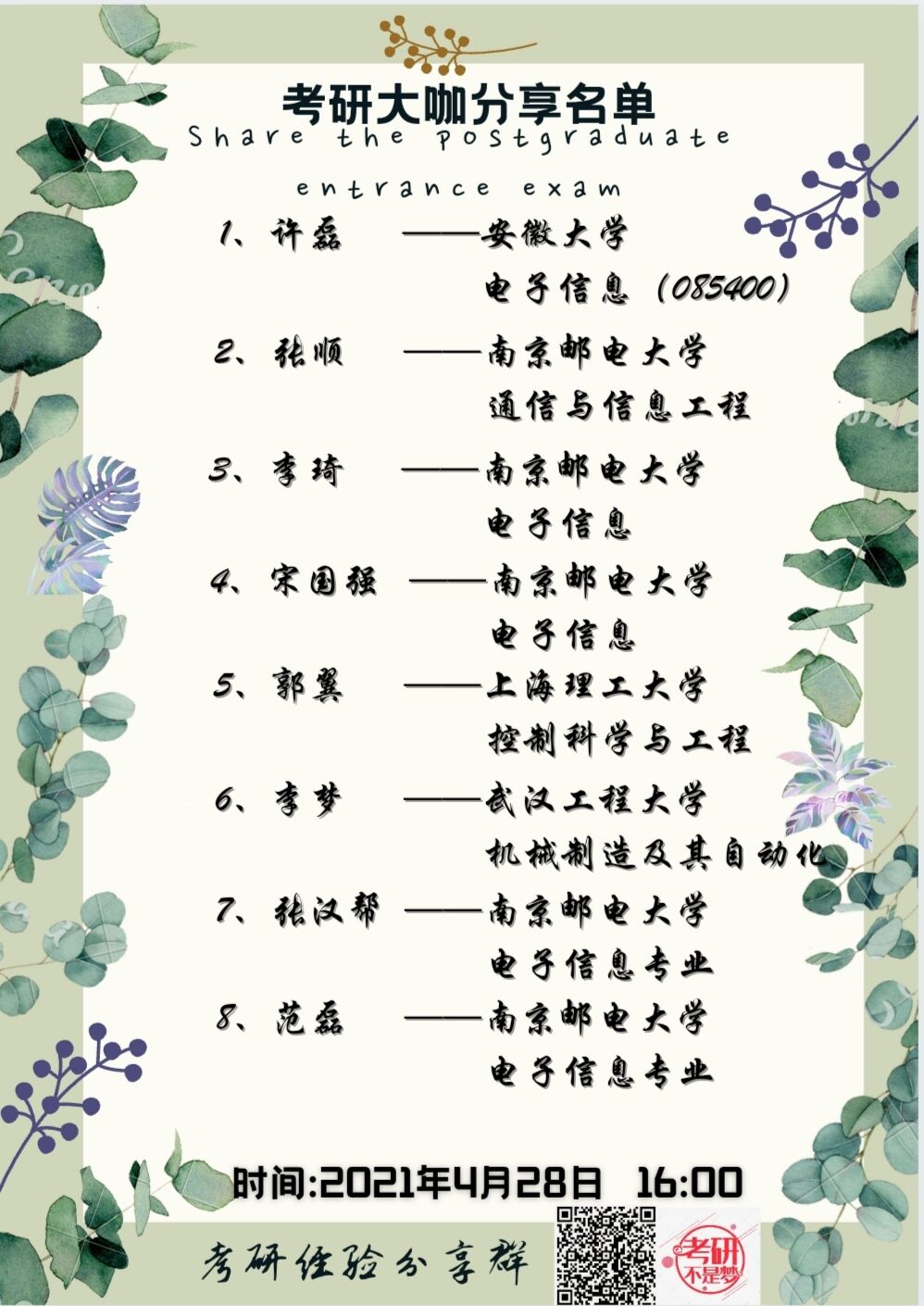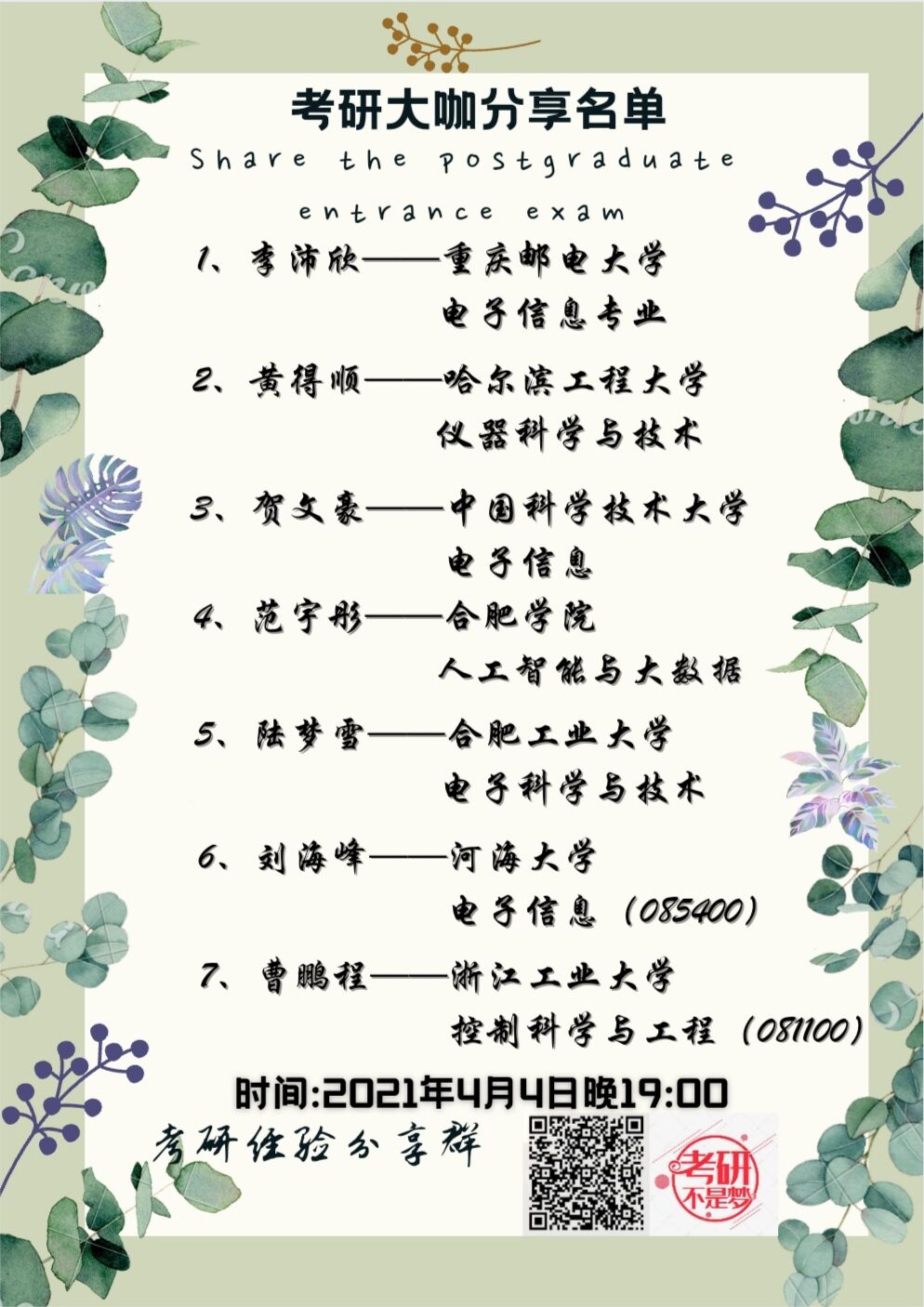 本次分享会邀请了已经在科大读研的15级贺文豪同学和今年考取南京邮电大学、武汉工程大学、上海理工大学、上海机电大学等高校研究生的17级各专业员工代表。学长学姐们分别介绍了自己的考研心得,并结合自己的复习经历讲述了在备考期间应注意的问题,包括考研各科的复习方法、考研信心的树立、考研计划、备考心态的调整、生活饮食习惯、作息时间安排,以及有关选择专业方向和复试等方面的一些经验体会。