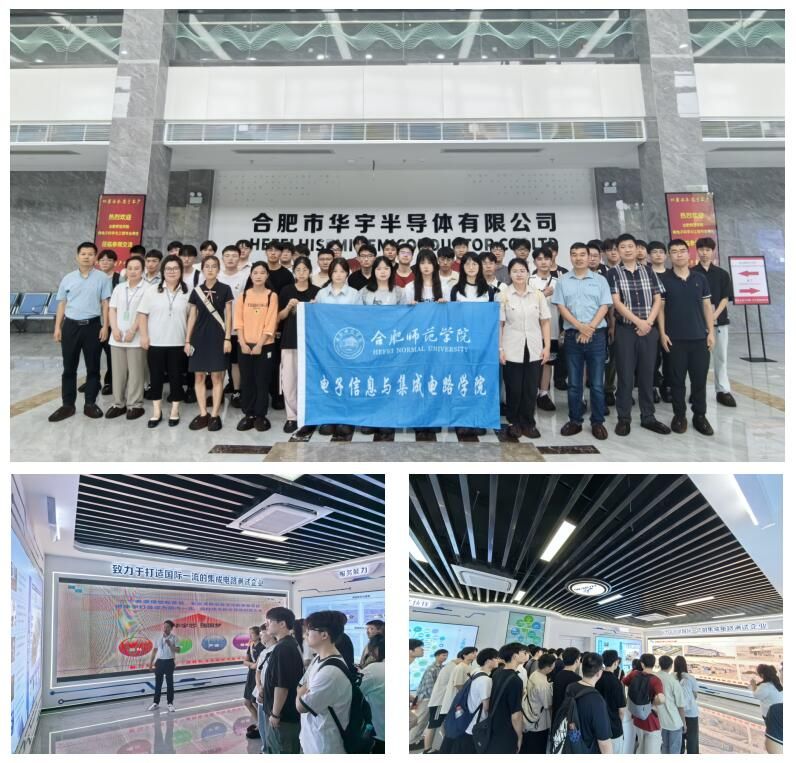 师生们首先来到合肥华宇半导体公司,人力资源主管唐经理热情接待了来访的师生,并详细介绍了公司的成长历程和主营业务。华宇半导体专注于大规模集成电路晶圆测试、FT成品测试及编带,其产品广泛应用于智慧城市、智能驾驶等领域。在参观过程中,销售主管通过智慧大屏展示了公司的核心技术,而生产车间主管则深入讲解了封装工艺和设备工作原理,员工们积极提问,与公司人员进行了深入的交流。