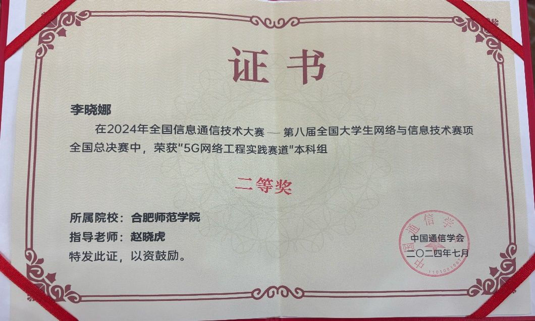 在教务处支持下,WilliamHill体育安排竞赛指导教师,对参赛队伍进行赛事全过程培训指导。最终,由赵晓虎老师指导的2023级通信工程2班李晓娜同学在以安徽、江苏、浙江、上海等7个省、直辖市的100余所高校组成的区域赛中荣获5G网络工程实践赛道(本科组)一等奖晋级全国总决赛,并在全国总决赛中经过激烈角逐和严格评审,荣获全国总决赛二等奖。