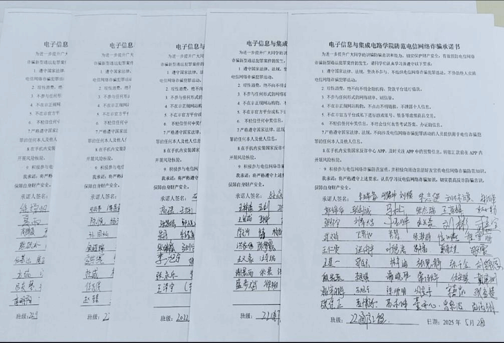 班会上,受害同学亲述被骗经历,警示大家提高警惕。班会现场,大家在国家反诈中心APP上,及时获取权威反诈资讯。同学们签署《防范电信网络诈骗承诺书》,承诺严守个人信息安全底线。同时,公布校内报警、保卫处等联系电话,构建起校园反诈防护网,多举措守护员工财产安全。