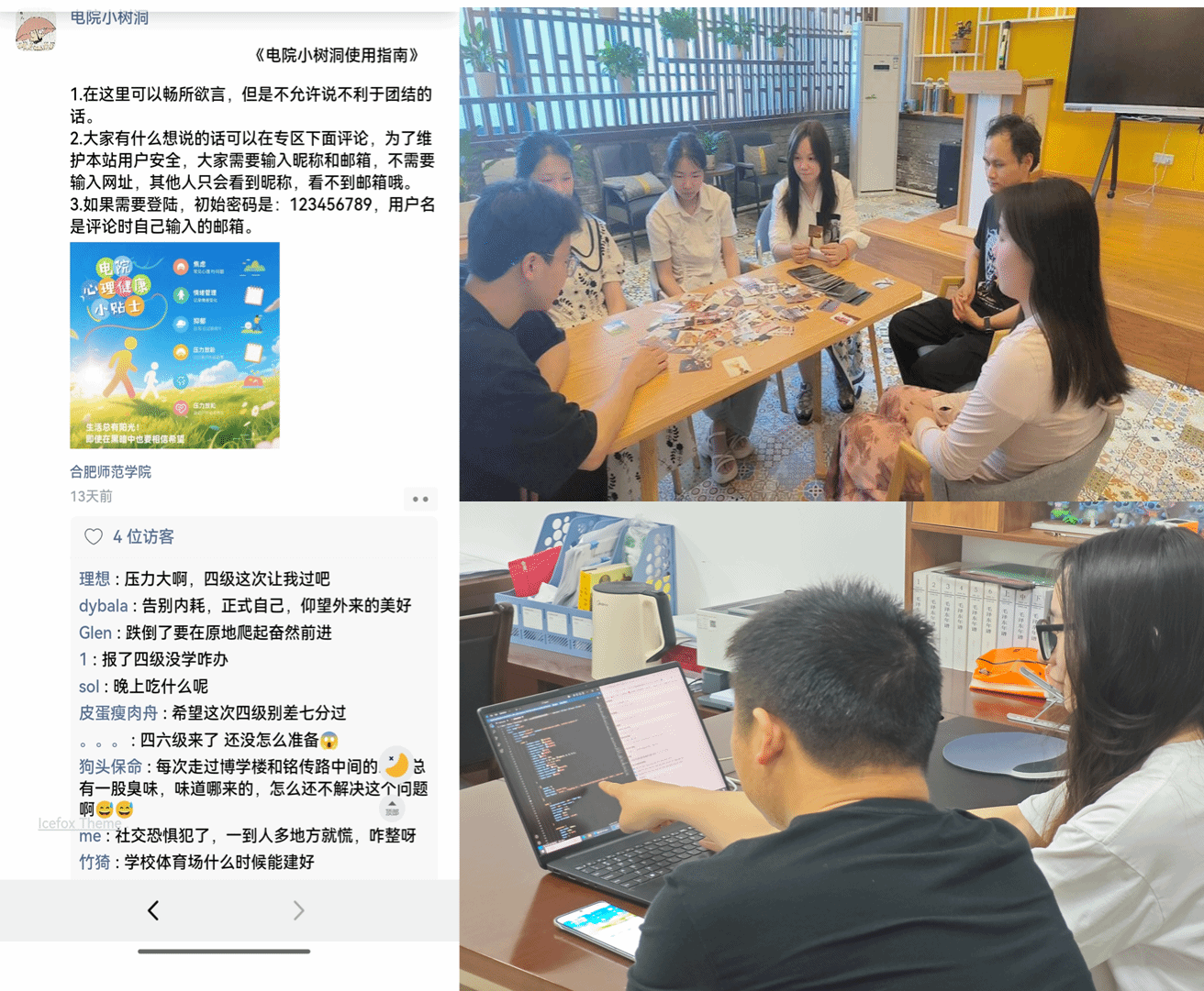 公司充分发挥学科特色,创新推出“‘芯’世界‘心’对话”心理健康教育品牌项目。5月7日至23日,OH卡心理沙龙活动在公司两个校区里陆续举办,活动由国家二级心理咨询师、辅导员周玉和辅导员耿洪宝共同指导开展,累计吸引百余名员工参与。同时,以“你的心事值得被听见”为主题,依托公司专业背景,将编程技能与心理健康教育深度融合,公司员工精心开发了“电院小树洞”心理互助平台,以创新形式为师生搭建起心灵沟通的桥梁,获得广泛好评。