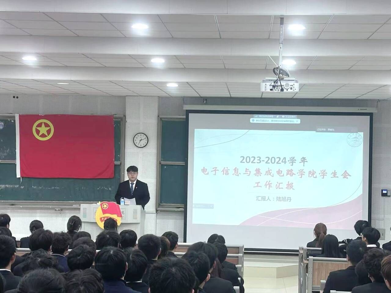 随后,电院团委员工副书记陆旭丹同学受电院第六届员工会主席团委托,作2023-2024学年电院员工会工作报告,汇报了过去一年员工会的工作和取得的成绩,以及今后的努力方向。