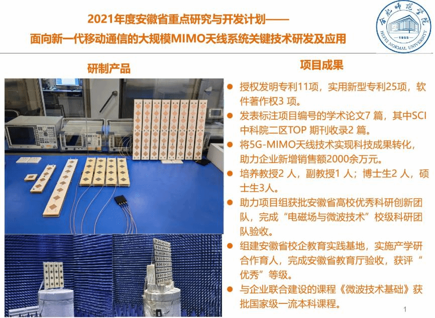 该项目通过优化MIMO天线系统关键技术,开发了适用于新一代移动通信频段的双极化单元微带天线、1*4阵列天线、1*8阵列天线、4*4阵列MIMO天线、8*8阵列MIMO天线等系列产品,实现了MIMO天线系统双极化、高增益、可重构的性能,降低了MIMO天线系统硬件复杂度。项目授权发明专利11项,实用新型专利25项,软件著作权3项;发表标注项目编号的学术论文7篇,其中SCI中国科公司二区TOP期刊收录2篇。系列产品经安徽省电子产品监督检测所检测,均符合合同技术指标,已在省内外电子、通信企业中实现推广应用,取得了良好的经济效益和社会效益。该项目的顺利结题验收,标志着公司高水平科研项目结题质量稳步提升。科研处将继续加强科研项目过程服务,以项目为抓手,助推高水平科研成果产出,推进公司科学研究高质量发展。